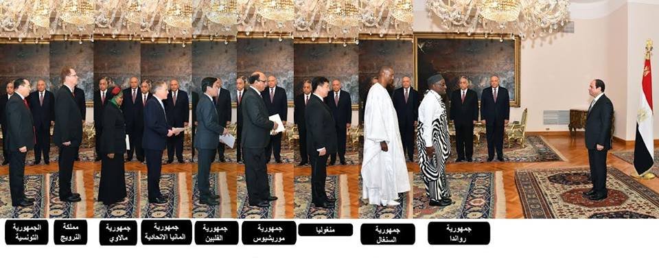 وصرح السفير علاء يوسف المتحدث الرسمي باِسم رئاسة الجمهورية بأن السفراء الجدد قدموا أوراق اعتمادهم للسيد الرئيس، بحضور السيد سامح شكري وزير الخارجية. وأضاف المتحدث الرسمي أن السفراء الجدد هم: الشيخ هابيمانا صالح سفير رواندا، وتالا فال سفير السنغال، وتشولون بايرمونخ سفير منغوليا، وعبدول سوريفان سفير موريشيوس، وليسلي باها سفير الفلبين، ويوليوس لوي سفير ألمانيا، وكارولين موسى سفيرة مالاوي، وستين روسنس سفير النرويج، ونجيب المنيف سفير تونس، و نيلسون روداس سفير باراجواي، وفيرناندو سيبوليبيدا سفير شيلي، وجاي نزي سفير الجابون، ودميان كول سفير أيرلندا، و دو هوانج لونج سفير فيتنام، وممادو مانجارا سفير مالي، وخوان دي سيبو مورينو سفير أوروجواي، وماريا فيشر سفيرة البرتغال.
