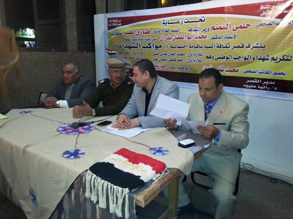 ومن جانبة أكد مدير عام ثقافة المنيا إن الإحتفالية تعد الأولي التي يقيمها الفرع وسط هذا الأجواء الوطنية والترحاب والسعادة من أهالي الشهداء التي عبرو عنها بالشكرلكل القائمين عليها قام د.شعيب خلف بالقاءقصيدة بعنوان يافجعة امك ياحمد والجدير بالذكر حضر في الإحتفالية اللواء مجدي أبو شادي مساعد مدير الا من بالمنيا نيابة عن السيد اللواءرضا طبلية مدير أمن المنيا.