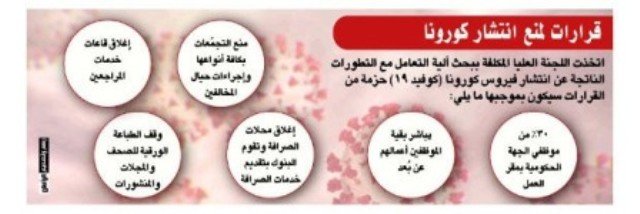 كما قررت اللجنة وقف الطباعة الورقية للصحف والمجلات والمنشورات بمختلف أنواعها ومنع تداولها ومنع بيع وتداول الصحف والمجلات والمنشورات التي تصدر خارج السلطنة.