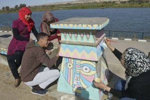“جرافيكس “طاقة متجددة من شباب المنيا، تتنوع أعمارهم وثقافتهم وخلفيتهم الايدلوجية، يتجمون ليصنعوا البهجة والابتسامة على الوجوه دون مقابل، رسموا ما رسموا على كورنيش النيل خلال عام جدارية بطول 2 كم “2000 متر” بألوان مبهجة ورسوم شعبية من واقع الفلكلور المصري ومستمرين، تحركوا لجمع القمامة وتوعية مترددي الكورنيش عن أهمية المظهر الجمالي حتى نجحوا في تطبيع الجمهور لخلق ساحة نظيفة وجميلة؛ يغنون ويعزفون ويلقون أشعارًا ويمثلون في الشارع؛ يحتفلون بالمناسبات على قدر طاقتهم؛ يتبنون أطفال الشوارع فنيًا ويقومون بتعليمهم كيفية الرسم والتلوين ليكونوا فناني المستقبل، قاموا باحتوائهم وإشراكهم دون تمييز ليكونوا عناصر فعالة داخل المجتمع.