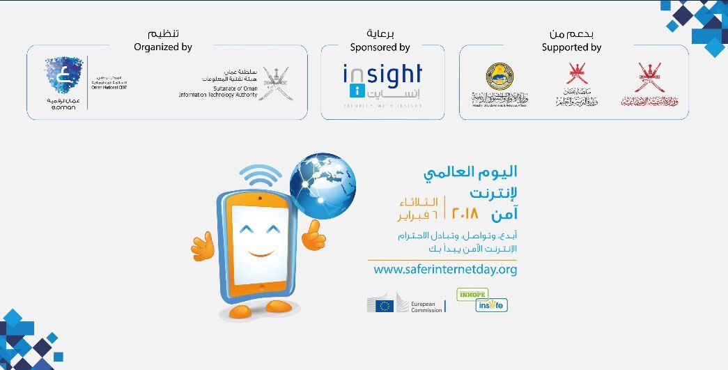 يوافق اليوم 6 فبراير 2018 اليوم العالمي لأنترنت آمن حيث تشارك سلطنة عمان بجانب 100 دولة بالعالم بالاحتفال بهذه المناسبة العالمية الهامة (اليوم العالمي لإنترنت آمن) والتي سيتم عقدها في مسقط جراند مول من الساعه 5 مساءا الى الساعه 10 مساءا، بتاريخ اليوم،بدعم من وزارات التعليم والتربية،التنمية الاجتماعية و الأوقاف والشؤون الاسلامية،وتنظيم كل من المركز الوطني للسلامة المعلوماتية و هيئة تقنية المعلومات و عمان الرقمية.وبالمناسبة صرح المركز الوطني للإحصاء والمعلومات أن 351,335 إجمالي منتفعي بالإنترنت الآمن داخل السلطنة بنهاية ديسمبر 2017 بنسبة ارتفاع بلغت 30.3% مقارنة بنهاية العام 2016.