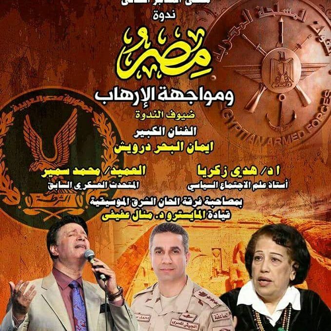 ضيوف الملتقى ، المطرب الكبير إيمان البحر درويش ، الدكتوره هدى زكريا استاذ علم الاجتماع السياسى ، المطرب الكبير أيمان البحر درويش و العميد محمد سمير المتحدث العسكرى السابق وتدير الملتقى الدكتورة ناهد عبد الحميد، وتقام الندوة بمصاحبة فرقة “الحان الشرق الموسيقيه “، بقيادة المايسترو د. منال عفيفى