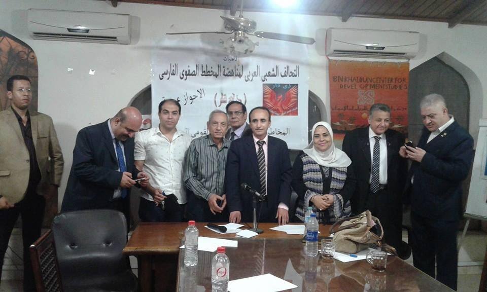 طالب التحالف الشعبى لمناهضة الصراع الصفوى جامعة الدول العربية باصدار قرار ملزم للاقطار العربية بتقيد حركة الدبلوماسين الفرس بالوطن العربى ويكون هناك موقف ضد الحشد الشعبي العراقي واعتباره جماعة إرهابية واصدار قرار ضد الاختراق الايرانى للدول العربية .