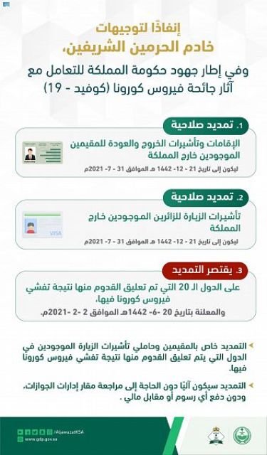 إنفاذًا لتوجيهات خادم الحرمين الشريفين الملك سلمان بن عبد العزيز آل سعود – حفظه الله -، بدأت المديرية العامة للجوازات بتمديد صلاحية الإقامات للوافدين الموجودين خارج المملكة، وتمديد صلاحية تأشيرات الزيارة، وتأشيرات الخروج والعودة، وذلك آليًا من دون رسوم أو مقابل مالي إلى تاريخ 21 / 12 / 1442هـ الموافق 31 / 7 / 2021م.