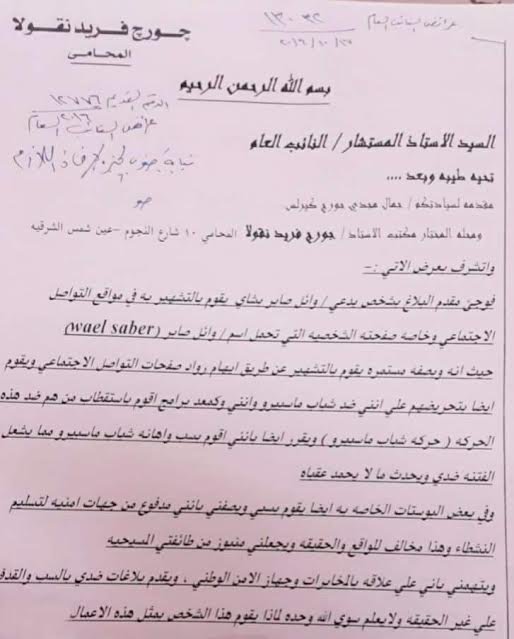 للنائب العام المستشار نبيل صادق  حمل رقم 13032 (عرائض النائب العام ) ضد  وائل صابر – يدعى رئاسته لكيان غير رسمى يحمل مسمى أتحاد أسر شهداء ماسبيرو – ” علي حد قول مقدم البلاغ  ” متهما اياه بالعمل على التشهير به على مواقع التواصل الأجتماعى و بعض المواقع ذات الصبغة القبطية وشخصنة الأمور بسبب حلقات اعدت فى بعض البرامج التلفيزيونية حول الذكرى الخامسة لمذبحة ماسبيرو زعم المشكو فى حقه انها لم تتم حسب أيديولوجيته الفكريه بالرغم من التزامها بقواعد المهنية الصحفية بطرح وجهتى النظر لضيفين يمثلان وجهتى النظر المختلفة .