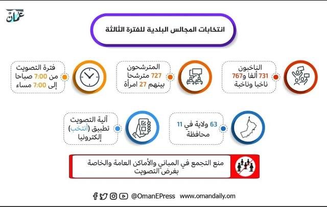 يدلي الناخبون العُمانيون في 63 ولاية بمختلف محافظات سلطنة عمان /اليوم/ الخامس والعشرون من ديسمبر2022، بأصواتهم لاختيار ممثليهم بالمجالس البلدية للفترة الثالثة، وذلك عبر تطبيق (أنتخب)، حيث حددت اللجنة الرئيسية للانتخابات بدء عملية التصويت من الساعة السابعة صباحًا إلى السابعة مساء، حسب توقيت سلطنة عمان مع مراعاة فارق التوقيت لكل محافظة، وستعلن النتائج مباشرة بعد الفرز ، حيث ستبدأ عملية الفرز الآلي فور انتهاء عملية التصويت.