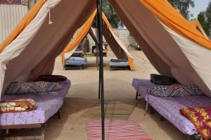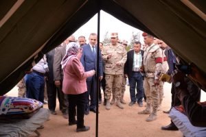 وقد قامت فاطمة الخياط وكيل وزارة التضامن الاجتماعي بالمحافظة بشرح محتويات المخيم وامكانياته وموارده البشرية والمادية حيث يتكون من 111 خيمة سكن للمضارين و27 خيمة خدمية للاستقبال وتسكين وصرف إعانات ومخازن مهمات وسله غذائية ومقصف ومطعم ومطبخ ومنزل متنقل ومستشفى ميداني بالإضافة الى فصل تعليمي ومشغل وقاعة توعية ومسجد وكنيسة .