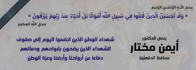 وقدم محافظ الدقهلية واجب العزاء لوالد الشهيد وأسرته وأكد لهم ولأهل القرية أن الدولة لا تنسى أبنائها الذين ضحوا بأرواحهم ودمائهم من أجل أمنها واستقرارها والحفاظ على تراب الوطن والذين يتصدون للأعداء والخونة.
