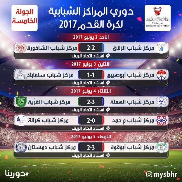 اختتمت الجولة الخامسة لدوري المراكز الشبابية لكرة القدم (#دورينا) الذي تنظمه وزارة شؤون الشباب والرياضة وذلك بتصدر فريق مركز شباب أبوقوة برصيد 13 نقطة، ثم حل مركز شباب الهملة وصيفا برصيد 12 نقطة.