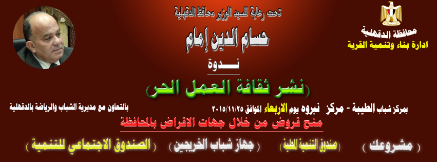 غدا الاربعاء الموافق 25/11/2015 الساعة 11 صباحا تحت رعاية الوزير محافظ الدقهلية/ حسام الدين إمام ندوة لنشر ثقافة العمل الحر بمركز شباب الطيبة مركز نبروه بنطاق مركز ومدينة بلفاس بالتعاون مع: – مديرية الشباب والرياضة – إدارة بناء وتنمية القرية المصرية الدقهلية – جهاز تشغيل شباب الخريجين بالدقهلية – المشــروع القومي للتنمية المجتمعية والشبابية والمحلية ( مشـــروعك )- الصندوق الاجتماعي بالدقهلية