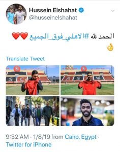 حرص حسين الشحات صانع ألعاب الأهلى على نشر صورته بالقميص الأحمر عبر حسابه الشخصى على موقع التواصل الاجتماعى “تويتر”، وعلق عليها “الحمد لله.. الأهلى فوق الجميع”.