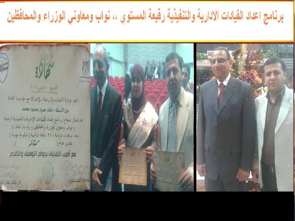 الحقوقي خالد حسين رئيس جمعية السواقي لتنمية المجتمع والبيئة والمحامي بالاستئناف العالي ومجلس الدولة الحاصل علي شهادة الاجازة من المقرر الخاص للامم المتحدة في الحق في تكوين الجمعيات والتجمع السلمي ورئيس نموزج مجلس محلي مركز سنورس بالفيوم التابع لوزارة الشباب استغرقت الدفعة 220 ساعة دراسية كدبلومة مهنية ، شملت التدريب علي المراسم البروتوكولية وفن الاتيكيت والتي حاضر فيها العقيد طارق عبد العزيز امين عام رئاسة الجمهورية الاسبق ودبلوماسية الاعلام لسكرتير نقابة الصحفيين الاعلامي هيثم الشيخ والنظام المالي الحكومي للدكتور شريف حسانين مدير المكتب الفني لرئيس الجهاز المركزي للمحاسبات واللواء احمد جاد رئيس اكاديمية الشرطة السابق مساعد وزير الداخلية ود. جمال حواش استاذ ادارة الازمات والتفاوض باكاديمية ناصر العسكرية واللواء محسن النعماني وزير التنمية المحلية الاسبق واخرين كان المحامي خالد حسين ابن الفيوم قد وصل للمرحلة النهائية والاخيرة عقب نجاحه بامتياز في 3 مراحل سابقة بدأها باكاديمية السادات للعلوم الادارية في مارس من العام الماضي ثم دورة مدينة الاقصر في مايو واعقبها الاسكندرية في فبراير 2015 انتهاءا بالنجاح الكبير في الدورة النهائية بالمركز الاولمبي بالمعادي في القاهرة مارس 2016 وحضرها بالانابة عن وزير الشباب السيدة نعمات ساتي رئيس الادارة المركزية للبرلمان والتعليم المدني والسيدة درية طلحة والسيدة اماني حسن مدير القيادات الشبابية بالوزارة