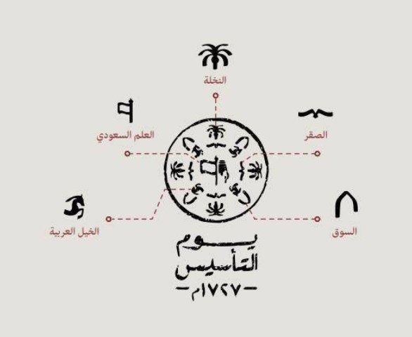 تتناغم خمسة عناصر جوهرية في شعار يوم التأسيس، هي: العلم السعودي، والنخلة، والصقر، والخيل العربية، والسوق، لتعكس في مضمونها تراثاً وطنياً حياً وأنماطاً مستمرة، رُسمت بنمط الخط التاريخي الذي دونت به إحدى المخطوطات التاريخية التي تؤرخ أحداث الدولة السعودية الأولى.
