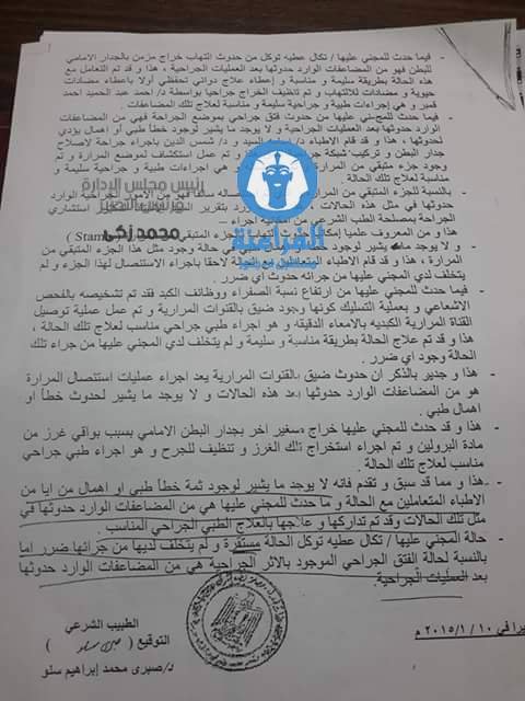 وان لا يوجد اي شبهه اهمال او ضرر وقع علي المريضه اثناء اجراء المدعو في حقه د. محمد مصطفي الموافي