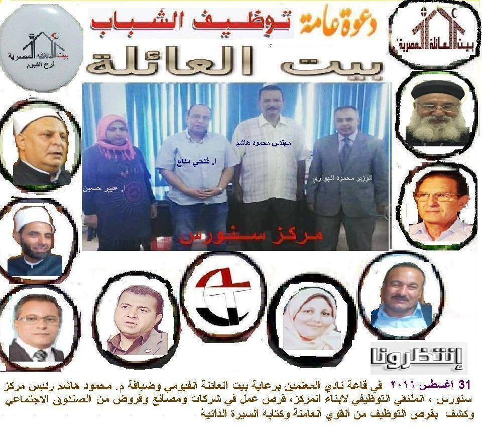 التواصل الاجتماعي بامانة بيت العائلة بمحافظة الفيوم والسيد فتحي مناع منسق عام البيت والسيدة عبير حسين عضو لجنتي الاعلام والاسرة للاتفاق علي تنظيم ملتقي لعرض فرص التوظيف وقروض ومشروعات الصندوق الاجتماعي وبيان الوظائف والمهن الموجودة لدي وزارة القوي العاملة والشركات الخاصة ، بالاضافة لمحاضرة عن كيفية كتابة السيرة الذاتية للمساعدة علي الالتحاق بالعمل ، يقام المؤتمر الخامسة عصر يوم 31 اغسطس بقاعة نقابة المعلمين بسنورس بحضور الشيخ عمر عبد التواب رئيس البيت والقمص روفائيل سامي الامين العام والشيخ احمد عبد الله الامين المساعد والمستشار سمير الجمال والنائب البرلماني اشرف عزيز ، حيث اسند تنظيم المؤتمر بمركز سنورس لكل من السيدة عبير حسين والسيدة ابتسام حسين والاعلامي خالد حسين ، يصاحب فقرات اليوم عروض جادة من اتحاد الصناعة وجمعية شباب مصر وشركة امريكانا التي ابدت استعدادها لتوفير 100 منحة تدريبية براتب شهري 1000 جنيه لكل شاب لديه الرغبة في الالتحاق بها . تجدر الاشارة بالذكر إلي ان بيت العائلة الفيومي اتجه مؤخرا لخدمة المجتمع من خلال تنظيم ندوات للاعلان عن الفرص المتاحة للتوظيف وبدأها بمركز اطسا ثم طاميه وسنورس ، كما نجح في تنظيم عدد من معارض المنتجات البيئية واليدوية التي تنظمها لجنة زوي الاحتياجات والقدرات الخاصة برئاسة مني عيسي ود. شيماء الشيمي وقامت بزيارته مؤخرا بنادي المحافظة النائبة البرلمانية نشوي حسين