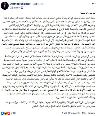 وجاء منشور أحمد شوبير عبر صفحته الرسمية على فيسبوك تحت عنوان (سرطان الرياضة) كالتالي: