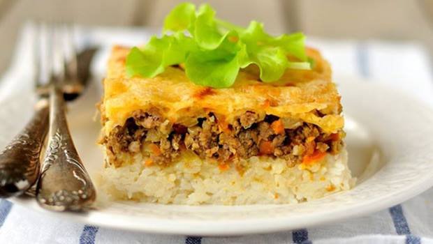 .٧- ضعي نصف مقدار الأرز الناضج وحاولي جعل السطح مستوٍ بملعقة خشبية. افردي طبقة من عصاج اللحم ثم ضعي باقي كمية الأرز وقومي بمساواة السطح مرة ثانية.