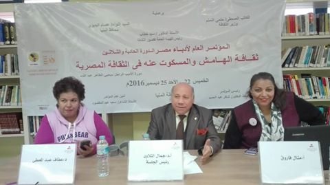 عقد الجلسة البحثية الثانية تحت عنوان مداخل نظرية لمفهوم الهامش فى الفكر الحديث وذلك فى اطار فعاليات مؤتمر ادباء مصر المقام بمحافظة المنيا فى الفترة من 22 حتى 25 ديسمبرالجارى ادار الحلقة الدكتور جمال التلاوى شاركت فيها الباحثتين د.عفاف عبد المعطى ببحث عن واقعية القاع ؛منال فاروق ببحث بعنوان