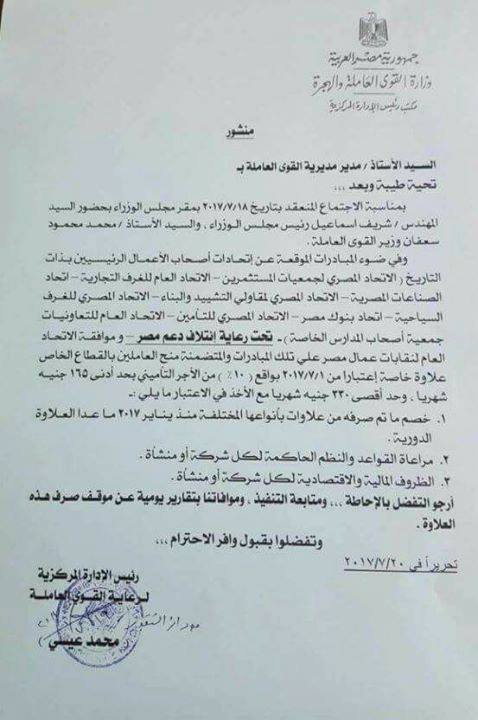 لقد صدر قرار العلاوة الذي انتظره العمال بشروط مجحفة لهم حيث لتعطى الحق فى ألمطالبه بها ونصه قرار العلاوة