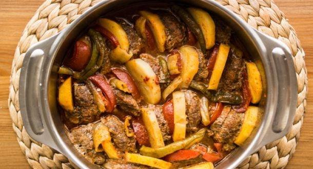 في صينية فرن مدهونة بالزيت رصي الخضار والكفتة كما هو موضح في الصورة أو بشكل دائري من الخارج إلى الداخل كالوردة بترتيب: كفتة ثم بصل ثم فلفل أحمر ثم كفتة ثم كوسة ثم فلفل أصفر ثم كفتة ثم باذنجان ثم طماطم ثم كفتة ثم بطاطس ثم فلفل أخضر وهكذا حتى تنتهي من الكمية.