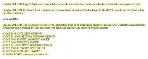 نشر موقع The Aviation Herald وهو موقع متخصص في أخبار الطيران تقرير يقول أن آخر إشارات تم تلقيها من الطائرة المصرية المنكوبة في الساعة 2:26 صباح يوم الخميس قبل إختفائها بتوقيت “زولو” وهو التوقيت العالمي للطيران الملاحي.
