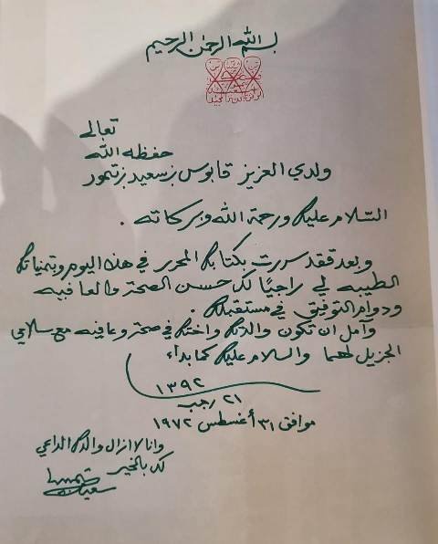 وتضمنت الموسوعة التاريخية، رسالة – تم الإعلان عنها للمرة الأولي – موجهة من السلطان سعيد بن تيمور رحمه الله إلى ابنه السلطان الراحل قابوس بن سعيد طيب الله ثراه، في 31 أغسطس عام 1972م.
