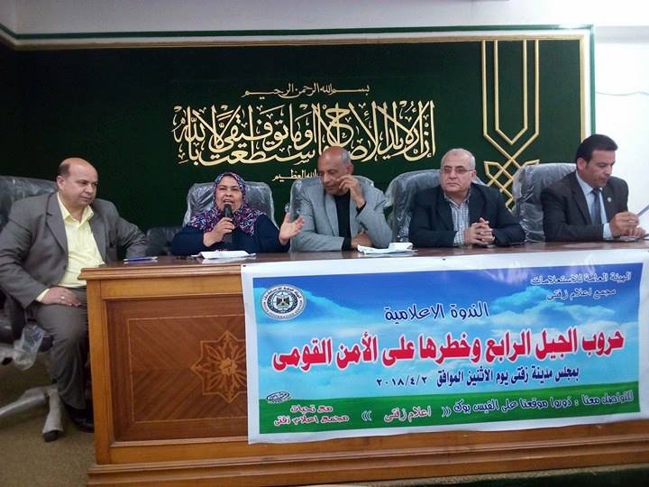 نظم مركز إعلام زفتى بالتعاون مع مجلس المدينة ندوة بعنوان ” حروب الجيل الرابع و خطرها على الأمن القومي ” بمقر قاعة المجلس. استهدفت الندوة التوعية بخطورة حروب الجيل الرابع . تحدث فى الندوة مصطفى السيد عيطة كبير المذيعين ومدير عام البرامج بالإذاعة المصرية موضحاً أنواع الحروب فقد تطورت من حروب الجيل الأول “جيشين نظاميين ومواجهة صاروخ ضد صاروخ” ثم الى حروب الجيل الثانى ( العصابات ) ثم حروب الجيل الثالث وهي وقائية وسريعة وخاطفة ثم حروب الجيل الرابع و من أدواتها( الحرب النفسية ــ العصابات ــ شبكة الانــترنـت وتغيير مفردات اللغة العربية الى جانب الضغوط الاقتصادية و تضم ( سموم قطريــة – اللعب فى البورصة – زيادة الأسعار – أزمة الدولار – ضرب السياحة – تصدير الأزمات) . وقال أن آليات حروب الجيل الرابع هي ( القوى الناعمة ــ القوى الذكية ) . وتهدف حروب الجيل الرابع الى زعزعة الاستقرار و التشكيك فى الجيش والشرطة والقيادات السياسية و ضرب الاقتصاد بضرب السياحة ونشر الشائعـــات وإغراقنا فى الديون و عمل صناعات مغذية للإرهاب و استخدام التكنولوجيا فى التنظيم . أشار الى التحديات التى تواجهها مصر و علاقة أمريكا بإسرائيل و أهداف إسرائيل في المنطقة العربية و دول الجوار الى جانب دعم أمريكا لإسرائيل نفسياً و استراتيجيا و اقتصــاديــــاً و إعلاميـــــاً. و أجاب على تساؤلات الحضور . وفي النهاية طالبوا بضرورة وضع رقابة على الانترنت لمنع انتشار الشائعات وسرعة الرد على الشائعة من قبل الجهة المختصة . شارك فى الندوة موظفو وموظفات مجلس المدينة وبعض الوحدات المحلية التابعة له . أدار فاعليات الندوة الأستاذة منى ابراهيم عمار أخصائي أول إعلام . بحضور : الأستاذ محمد الاتربى نائب رئيس المدنية . الأستاذ طارق عبد الله نائب رئيس المدنية لشئون القرى. الأستاذ هاني الكفافى مدير العلاقات العامة. الأستاذ صبحى عليوة بالعلاقات العامة . تحت إشراف الأستاذ محمد صلاح رضوان ـ مدير المجمع الإعلامي . و الأستاذ سمير مهنا مدير عام إدارة إعلام وسط الدلتا .