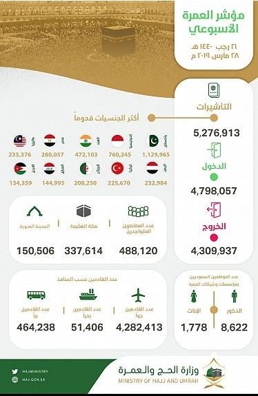 أصدرت وزارة الحج والعُمرة السعودية تقريرها الاسبوعي بشأن مؤشرات العمرة وأعداد الوافدين والمغادرين للأراضي المقدسة، حيث أظهر المسح إصدار 5276913 مليون تأشيرة عُمرة حتى يوم الخميس الماضي، بينما وصل مجموع القادمين الى المملكة نحو 4768057 مليون معتمرًا، في حين بلغ عدد المعتمرين المتواجدين داخل المملكة 488120 معتمرًا، منهم 337614 في مكة المكرمة، بينما يتواجد 150506 من المعتمرين في المدينة المنورة.