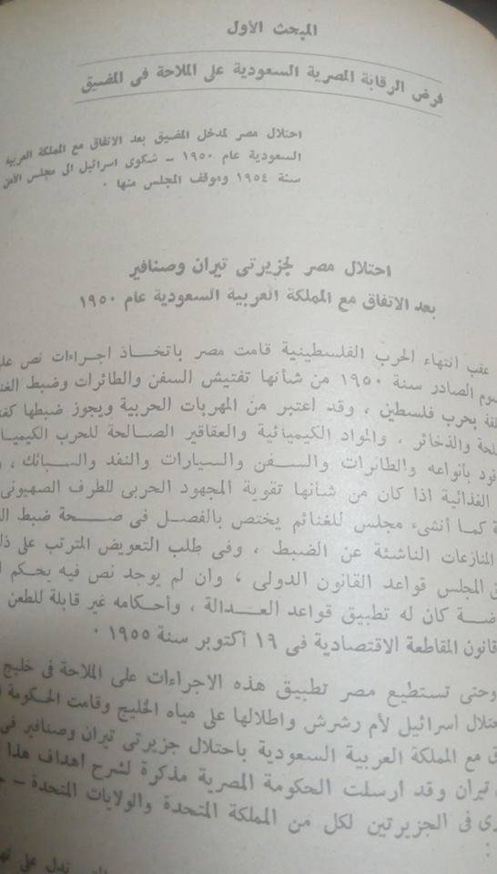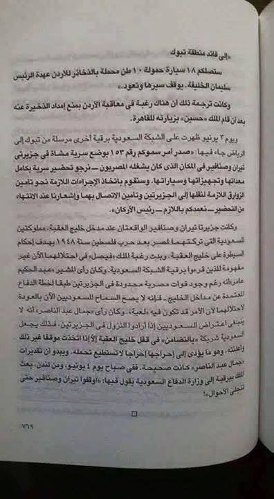 ثانيا : وثيقة أخري نشرها أعظم كاتب صحفي مصري في نصف القرن الاخير (اختلف أو تتفق معه لكنه كذلك) والتي جاءت في كتاب ” الانفجار ” للراحل / محمد حسنين هيكل وتؤكد بلا جدل أن الجزيرتين ملكية خالصة للسعودية حتي وإن كانت تحت الحماية المصرية منذ 66 عام .. حتي قرر الزعيم المصري / عبدالفتاح السيسي – رئيس الجمهورية – موافقة الدولة علي إعادة ترسيم الحدود مع الشقيقة المملكة العربية السعودية ، وأعاد لها الحق في حيازة أرضها.