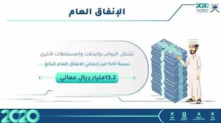 و قُدر إجمالي الإنفاق العام بنحو (13) مليارا و(200)مليون ريال عماني بارتفاع قدره (2) بالمائة عن الإنفاق المقدر للعام 2019.