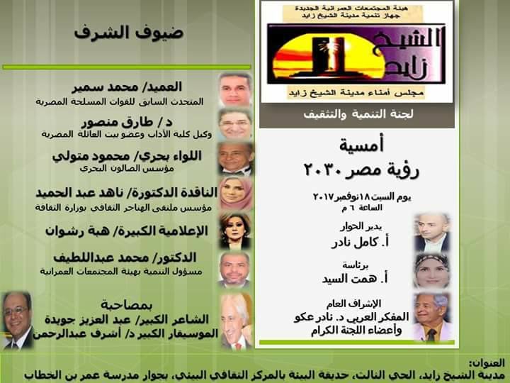 في مدينة زايد يوم السبت ١٨ نوڤمبر ٢٠١٧ الساعة ٦ م بالمركز الثقافي البيئي بالحي الثالث تقيم ندوة لإستعراض رؤية مصر للتنمية المستدامة وسبل التطور والإستعانة بأصحاب الإرادة والعزيمة والخبرة لعودة مصر لمكانتها الطبيعية كما يحب أن يراها المصريين والمجتمع الدولي