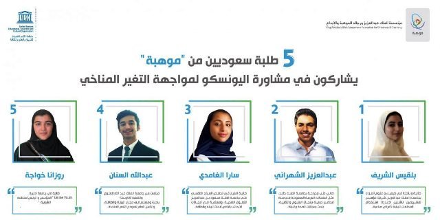 ومثّل “موهبة” في مشاورة اليونسكو الإلكترونية خمسة طلاب وطالبات، هم: الطالبة الموهوبة بلقيس الشريف، والطالب الموهوب عبدالعزيز الشهراني، والطالبة الموهوبة سارا الغامدي، والطالب الموهوب عبدالله السنان، والطالبة الموهوبة روزانا خواجة، وجميعهم سبق لهم مشاركات في مسابقات محلية ودولية، وحققوا إنجازات على الصعيد الوطني والدولي بأبحاث ومشاريع علمية متعلقة بأبحاث البيئة.