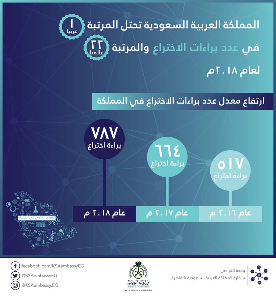 تصدرت المملكة العربية السعودية للعام الثاني على التوالي المشهد العربي في عدد براءات الاختراع المسجلة لعام 2018، بإجمالي 787 براءة اختراع، احتلت بهم المرتبة الأولى عربياً والـ 22 عالمياً، وذلك بحسب الأرقام الصادرة من مكتب براءات الاختراع الأمريكي التابع لوزارة التجارة الأمريكية والمرتبط بمكتبي الاختراعات الأوروبي والياباني (USPTO).